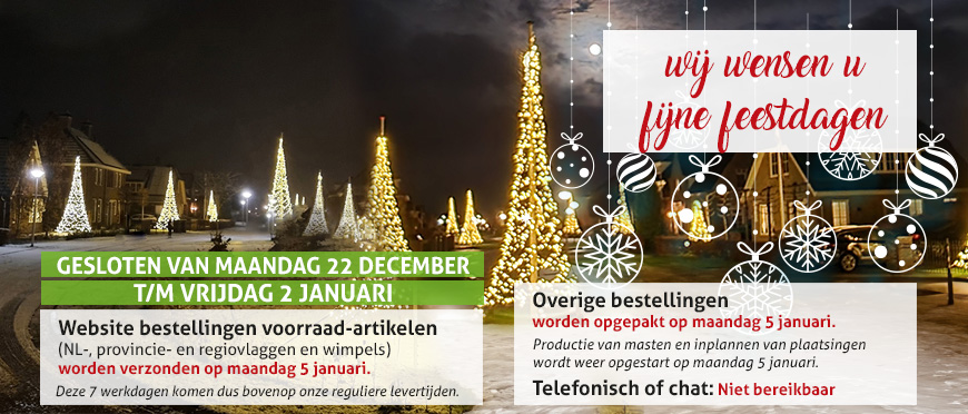 Bij ons kunt u terecht voor allerlei verschillende vlaggen. Hierbij kunt u denken aan de populaire Nederlandse vlaggen, maar ook aan bedrukte vlaggen of kleine tafelvlaggen. Met onze bouwhekdoeken maakt u van een simpel bouwhek een communicatiemiddel. Ook voor een bijbehorende mast -van baniermast tot vlaggenmast- kunt u bij ons terecht. In ons assortiment vindt u masten van verschillende afmetingen. Wij plaatsen deze masten door heel Nederland.